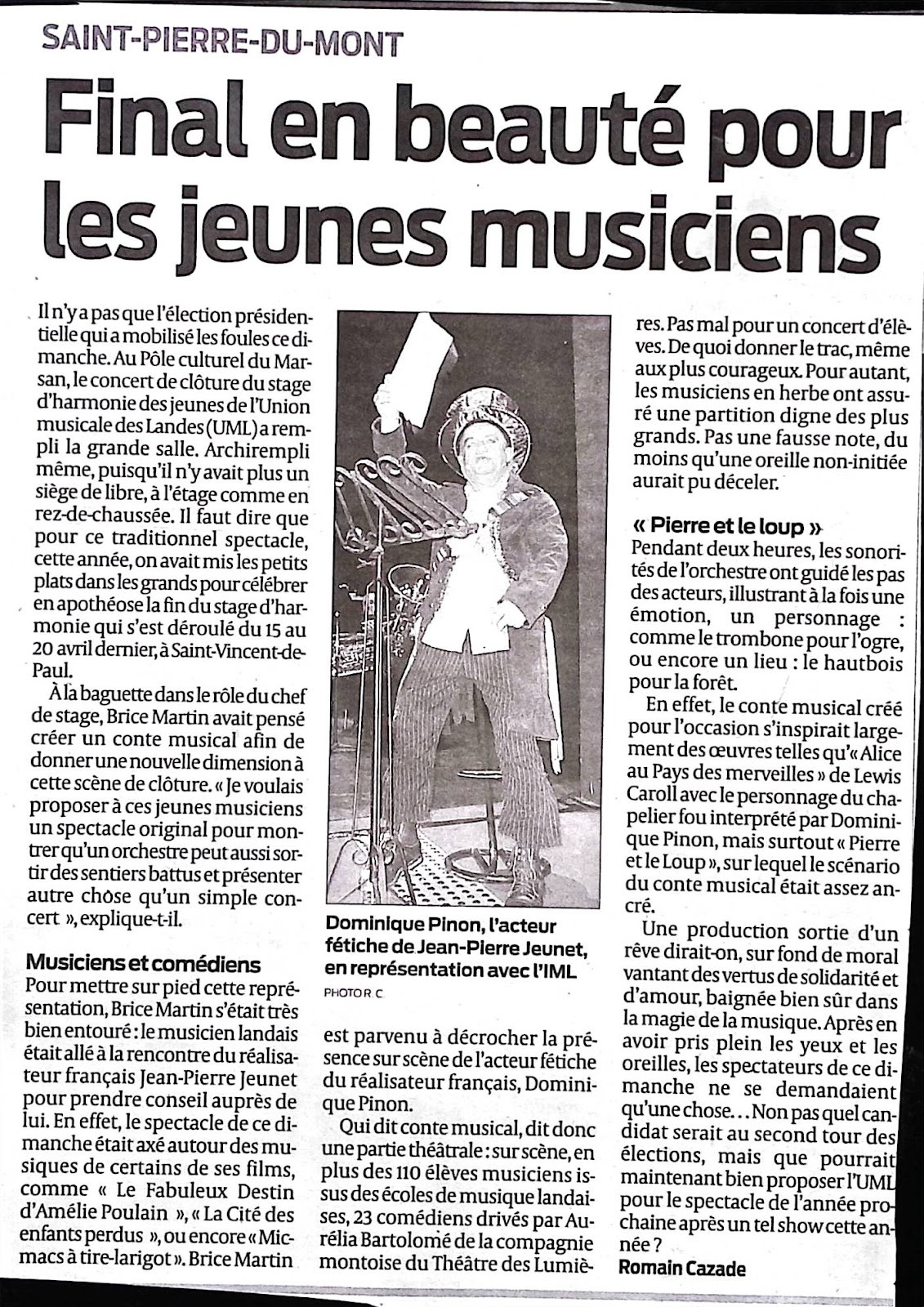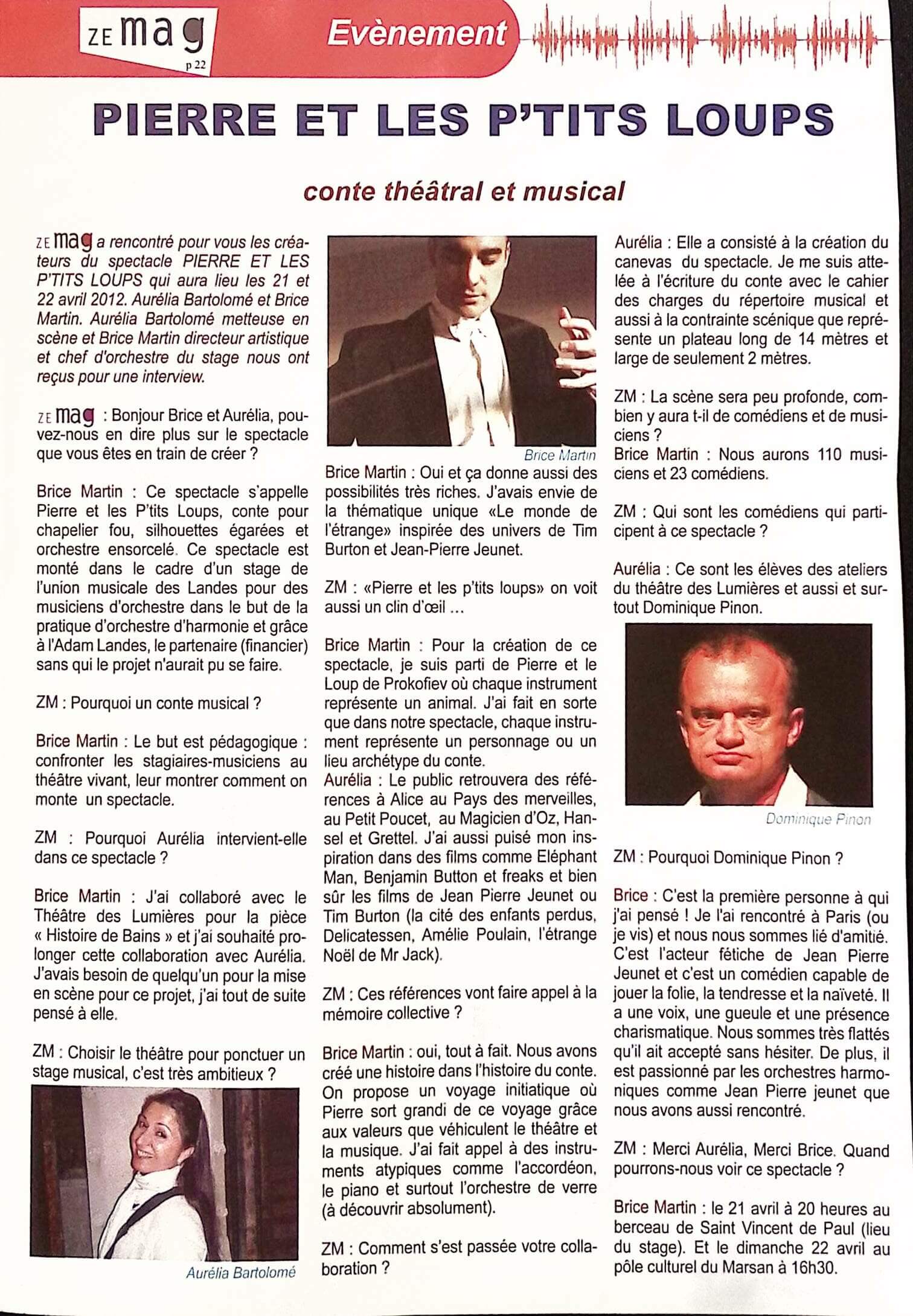 2012 marque une année de rupture avec la mise en place d’un Spectacle intitulé « Pierre et les P’tits Loups », un conte théâtral et musical créé par Brice Martin (directeur artistique et chef d’orchestre) et Aurélia Bartolomé (mise en scène). Le projet est né dans un cadre pédagogique, réunissant de nombreux stagiaires musiciens et comédiens, avec le soutien de l’Adam Landes.